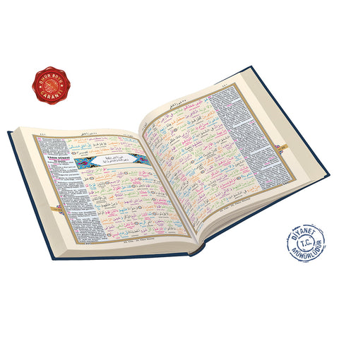 Kelime kelime farklı renklerde ifade edilmiş arapça metin ve türkçe meali, ayrıca kelime kelime renklendirilmiş olup, aynı renkte altına meali yazmaktadır.